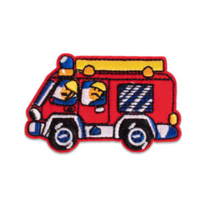 Here is a popular fabric patch depicting a red fire truck on its way to a firefighting mission. Two firefighters wearing yellow helmets can be seen looking out from the truck. The vehicle is equipped with typical gear such as a fire ladder and blue lights. The fire truck measures approximately 7 cm and has an iron-on backing.