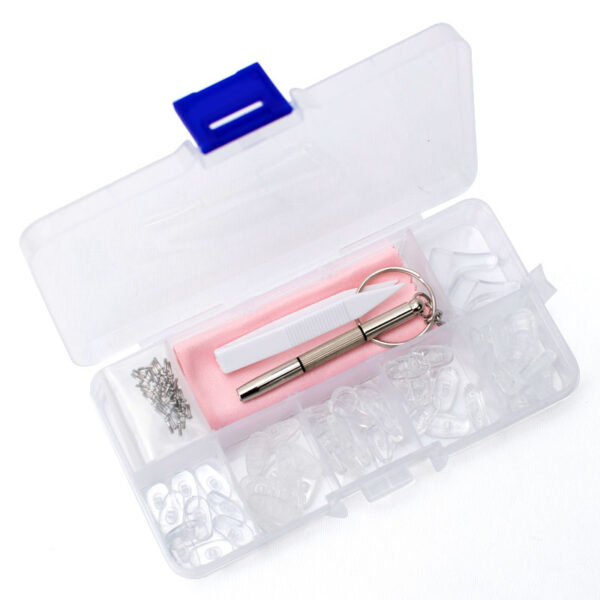 A practical repair kit containing everything you need to easily replace the nose pads on your glasses. The components are neatly stored in a handy box with a secure locking function.
