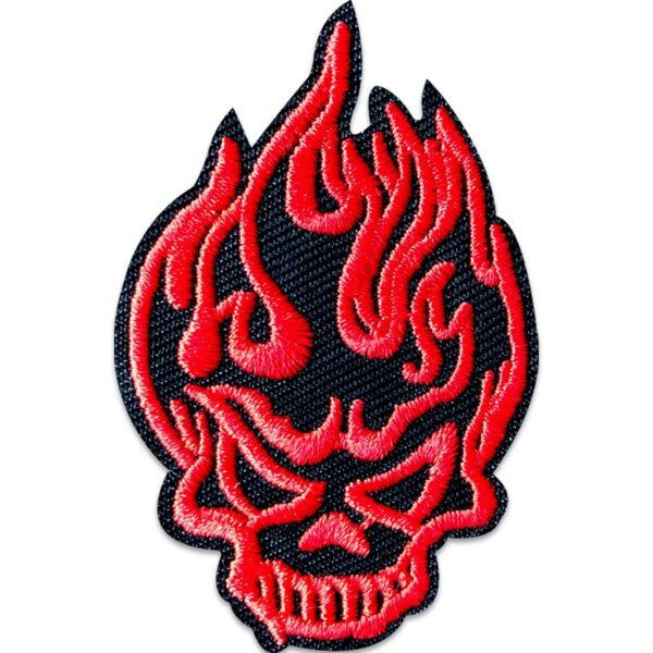 Flaming Skull is a patch embroidered on black felt fabric, making it flexible and easy to iron on.