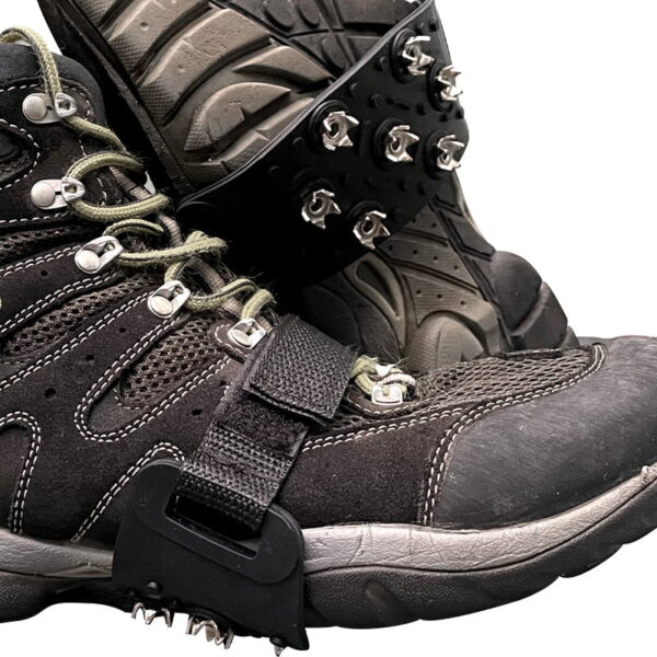 There are many types of ice grips on the market, and we have tested several models. What made us choose this one is how quick and easy they are to put on. The quality also feels superior. These ice grips are not designed for hiking on icy mountains but are excellent for everyday use and outdoor activities. The Velcro strap holds securely, ensuring a stable fit.