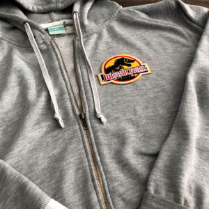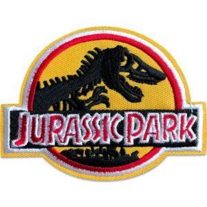 Jurassic Park patch measuring 9.4 x 6.8 cm. Use it to cover a hole or tear, or simply for decorative purposes. It can be ironed onto clothing, and may also work on other types of fabric.