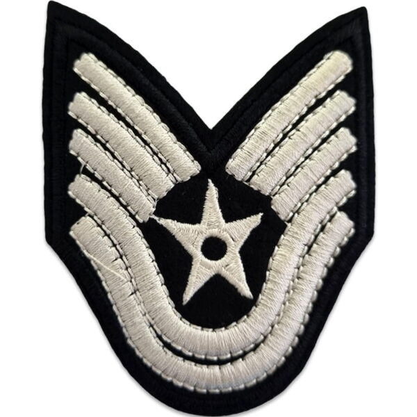 Embroidered patch depicting a military emblem and a star. The thread is silver-coloured against a black background, and the patch measures 6.8 x 8.5 cm. You can iron this patch onto fabric items such as clothes, as well as fabric shoes and backpacks.