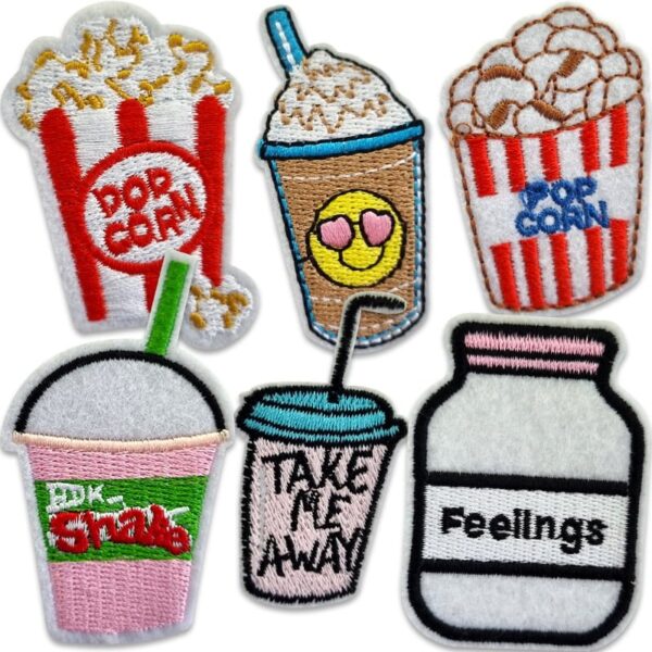 This set includes fabric patches depicting popcorn and various drinks. All patches are iron-on, and an ironing guide is included with your purchase.