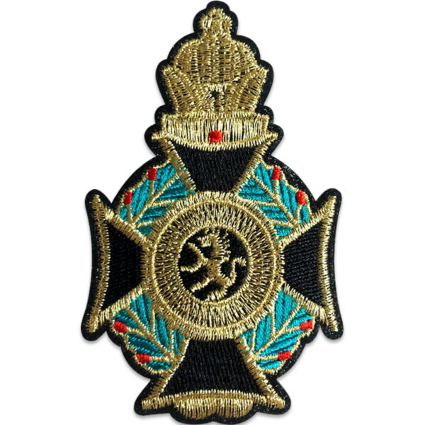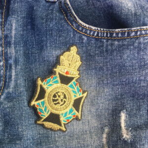 Decorative patch with a black cross and green details, featuring a royal crown. Stylish to iron on as a decoration or to mend small holes. Gold-coloured thread adds extra shine. Includes ironing instructions.