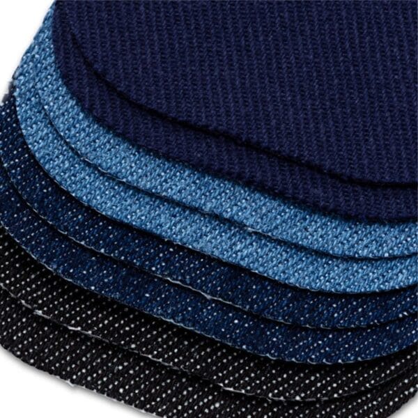 A set of small denim repair patches in mixed colours. These rectangular patches with rounded corners measure 6 × 8 cm, making them slightly shorter but just as wide as a business card.