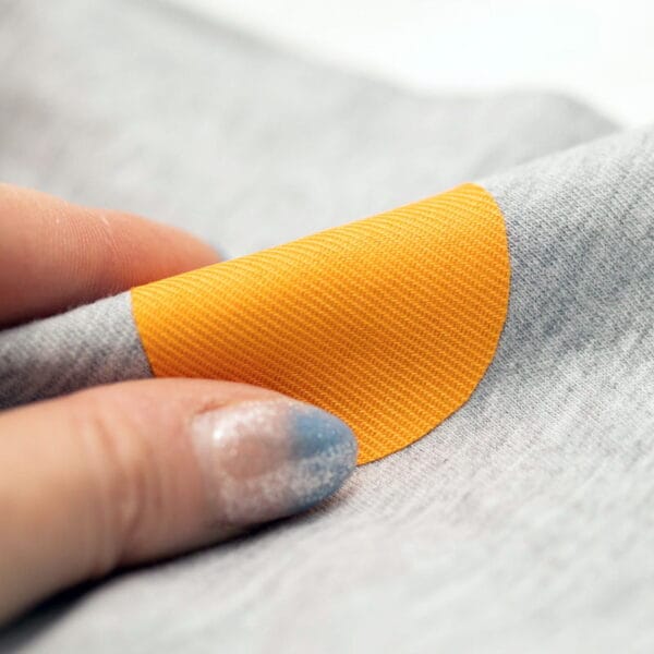 These patches adhere very well to cotton and also work on many synthetic materials. Depending on the fabric composition, reinforcing with a few stitches may be needed.