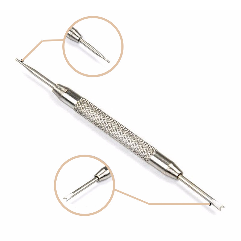 A practical tool for replacing watch straps, links, or buckles. Designed for a secure grip, the knurled steel handle ensures precise control and ease of use.