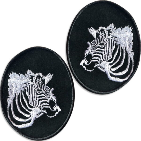 Embroidered zebras on oval patches measuring 8.1 x 9.9 cm. You can iron the zebras onto clothes or other fabrics.